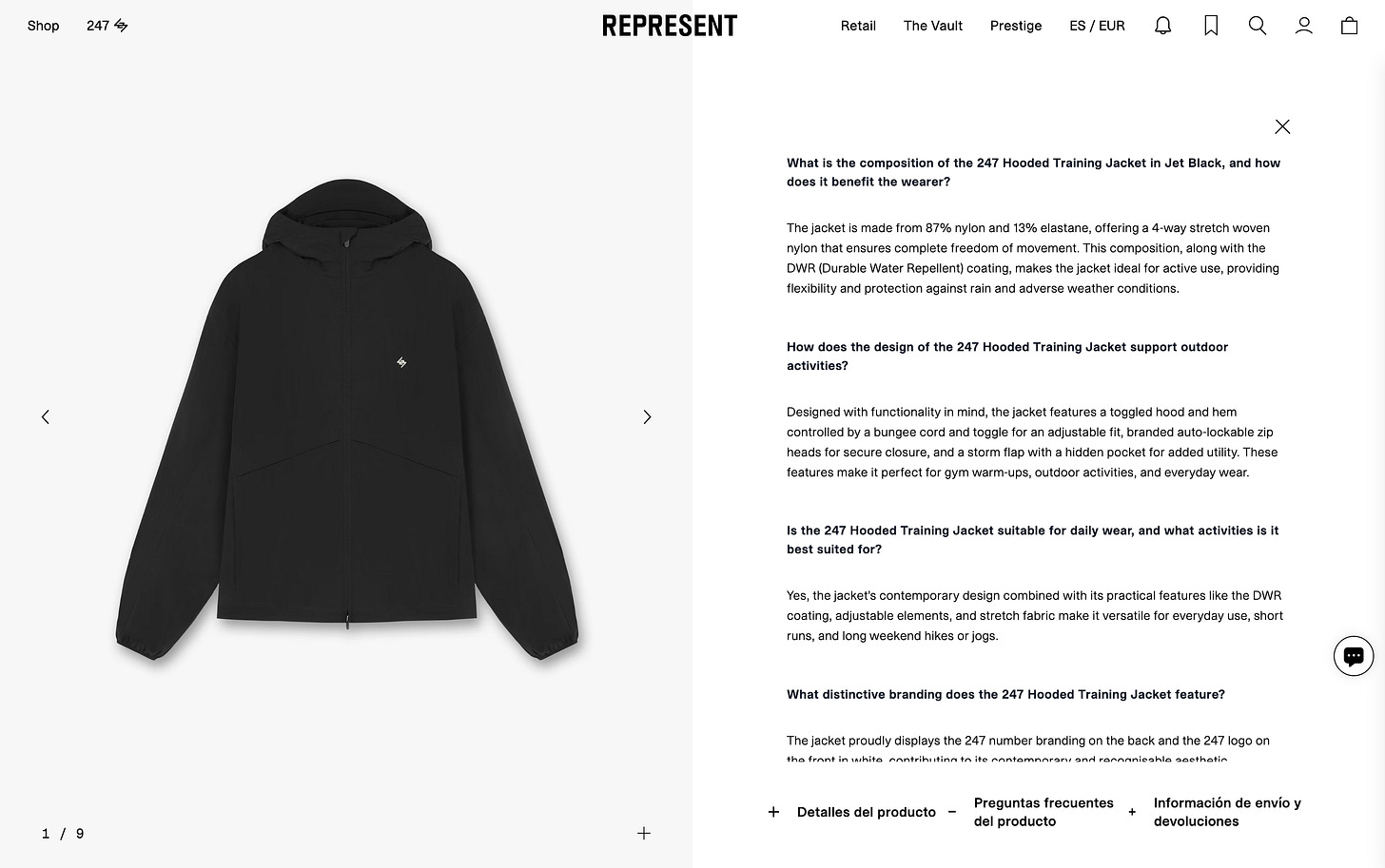 Esto es algo que cobra mucho sentido en una marca de lujo como Represent, pero es que incluso crean unas FAQs específicas para el producto en cuestión: